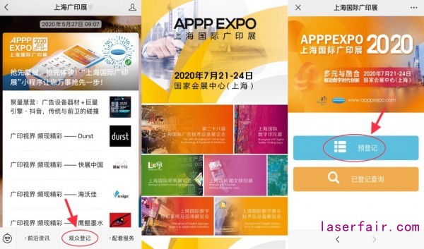 1. 關(guan) 注微信公眾(zhong) 號“上海廣印展”,於(yu) 底部菜單欄點擊“觀眾(zhong) 登記”,點選您感興(xing) 趣的展會(hui) 名稱,進入預登記頁麵