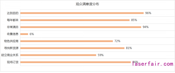 據統計,前來觀展嘉賓目的明確, 86%的買(mai) 家表示會(hui) 現場訂貨,59%想建立商業(ye) 關(guan) 係, 81%尋找新貨源,72%物色新供應商,6%搜集行業(ye) 信息和產(chan) 品信息;94%的觀眾(zhong) 對展會(hui) 整體(ti) 效果很滿意,85%表示每年都來,96%表示能達到預期目的。