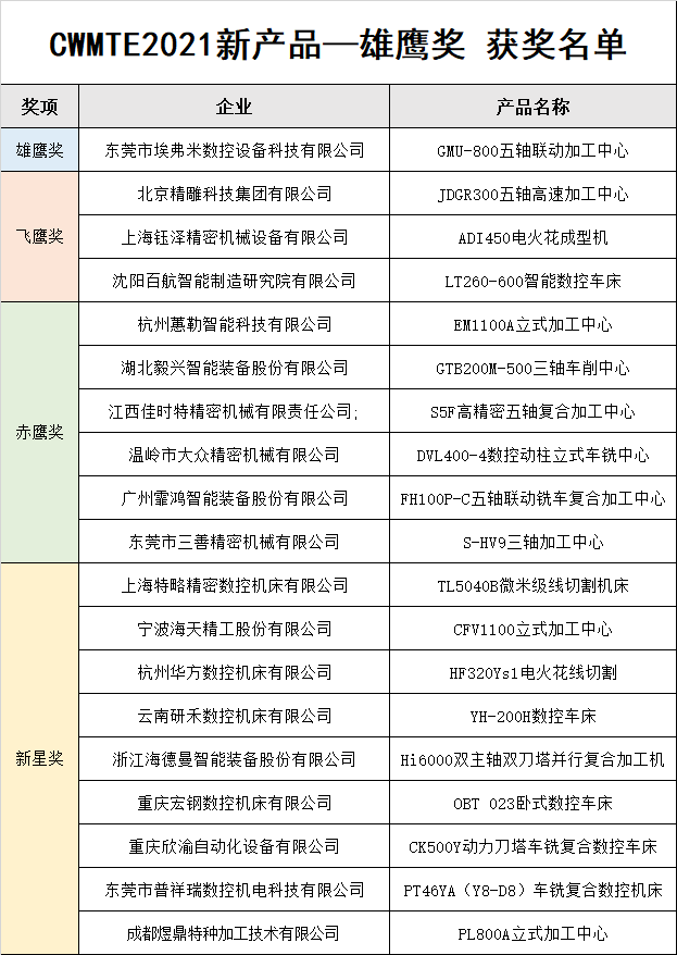 第二屆“新產(chan) 品-雄鷹獎評選活動”號召雄鷹之勢,見證榮耀誕生。經過立嘉技術專(zhuan) 家顧問團票選、行業(ye) 專(zhuan) 家票選,以及展會(hui) 現場開幕首日,專(zhuan) 家考察以及“機床屆奧林匹克大賽”現場測評評選出第22屆立嘉國際智能裝備展覽會(hui) 上“雄鷹獎”、“飛鷹獎”、“赤鷹獎”、“新星獎”創新產(chan) 品、技術進行宣傳(chuan) 表彰。(了解詳情請點擊下方圖片)注:雄鷹獎獲獎名單文末。