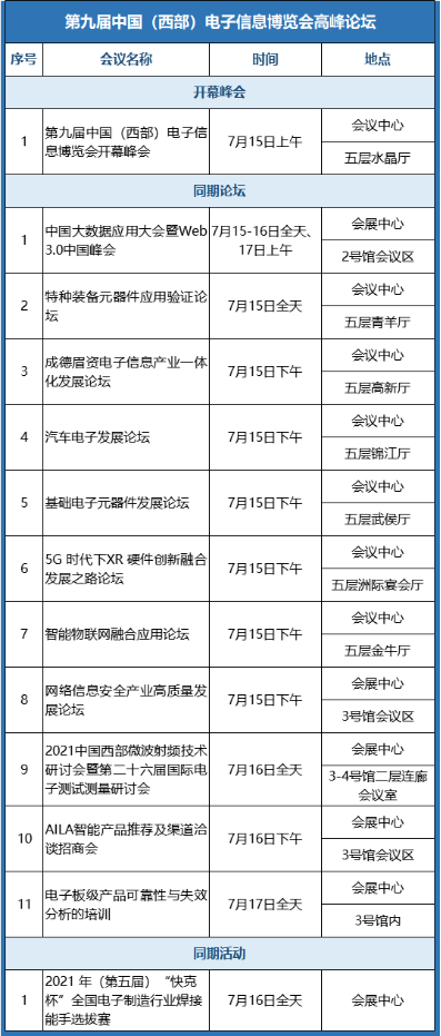 第九屆中國(西部)電子信息博覽會(hui) 同期將在成都世紀城國際會(hui) 議中心舉(ju) 辦十餘(yu) 場論壇。論壇將分別關(guan) 注汽車電子、關(guan) 鍵電子元器件、人工智能、智能物聯網融合、網絡安全、大數據存儲(chu) 等熱點話題,匯聚行業(ye) 領袖、技術精英以及國際國內(nei) 機構、組織、企業(ye) 和行業(ye) 用戶、高校科研院所等,探尋發展共識。
