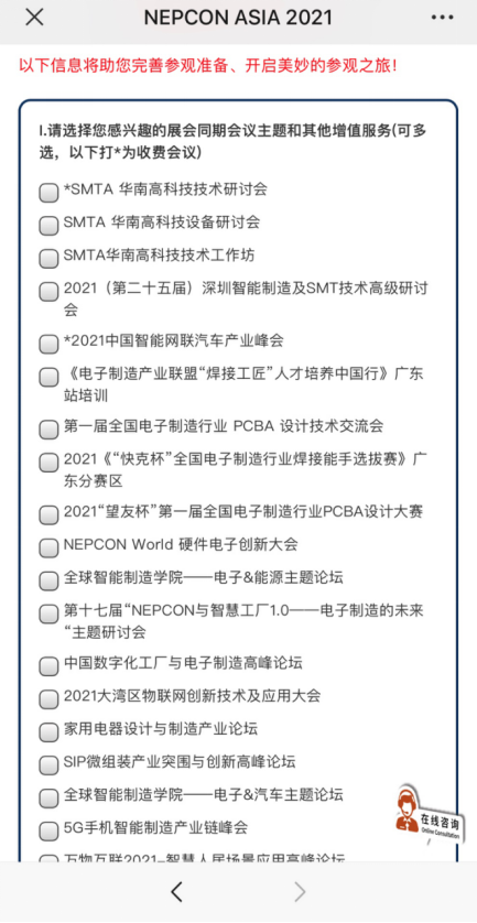 NEPCON ASIA 2021已進入開幕倒計時,預約參觀通道將於(yu) 10月18日關(guan) 閉,掃描文末二維碼,免費預約參觀,按照步驟完善您的個(ge) 人信息後,您可以在後續頁麵中勾選您有意向參與(yu) 的活動(如下圖所示),願我們(men) 的服務能帶給您美好的參觀體(ti) 驗!