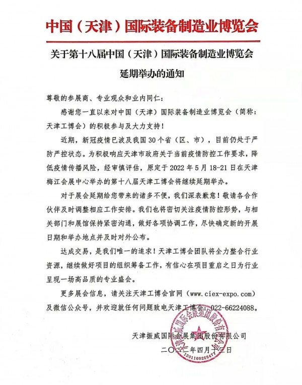 感謝您一直以來對中國(天津)國際裝備製造業(ye) 博覽會(hui) (簡稱:天津工博會(hui) )的積極參與(yu) 及大力支持! 近期,新冠疫情已波及我國30個(ge) 省(區、市),目前仍處於(yu) 嚴(yan) 防嚴(yan) 控狀態。為(wei) 積極響應天津市政府關(guan) 於(yu) 當前疫情防控工作要求,降低疫情傳(chuan) 播風險,經審慎評估,原定於(yu) 2022年5月18-21日在天津梅江會(hui) 展中心舉(ju) 辦的第十八屆天津工博會(hui) 將繼續延期舉(ju) 辦。具體(ti) 時間另行通知。