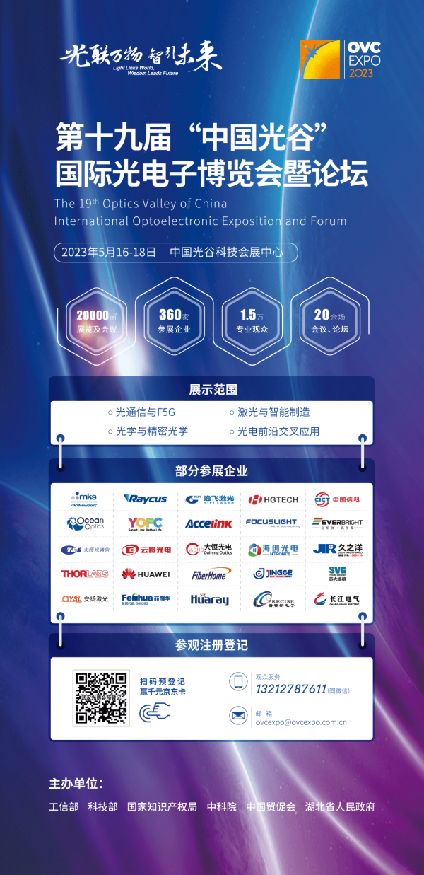 導語:第十九屆“中國光穀”國際光電子博覽會(hui) 暨論壇(以下簡稱“武漢光博會(hui) ”)將於(yu) 2023年5月16-18日在中國光穀科技會(hui) 展中心盛大召開。