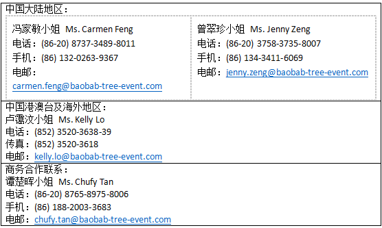 黎楚晴女士 Ms. Alice Li 電話: (86-20) 3758-3765-8032 電郵: alice.li @baobab-tree-event.com | 何惠婷女士 Ms. Candy He 電話:(86-20) 3758-3765-8003 電郵: candy.he @baobab-tree-event.com |