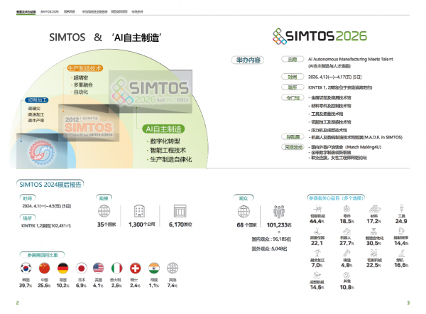 2026年韓國國際機床展覽會(hui) (SIMTOS)是韓國一個(ge) 專(zhuan) 注於(yu) 機床和金屬加工行業(ye) 的展覽會(hui) ,旨在為(wei) 這些行業(ye) 的專(zhuan) 業(ye) 人士提供一個(ge) 交流和展示最新產(chan) 品和技術的平台。該展覽會(hui) 聚集了來自世界各地的機床和金屬加工設備、技術和服務供應商,為(wei) 參展商和觀眾(zhong) 提供了一個(ge) 了解最新市場趨勢和技術創新的機會(hui) 。
