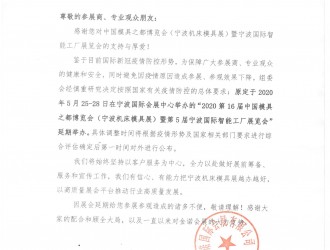 尊敬的參展商、專(zhuan) 業(ye) 觀眾(zhong) 朋友:感謝您對中國模具之都博覽會(hui) (寧波機床模具展)暨寧波國際智能工廠展覽會(hui) 的支持與(yu) 厚愛!鑒於(yu) 目前國際新冠疫情防控形勢,為(wei) 保障廣大參展商、專(zhuan) 業(ye) 觀眾(zhong) 的健康和安全,...